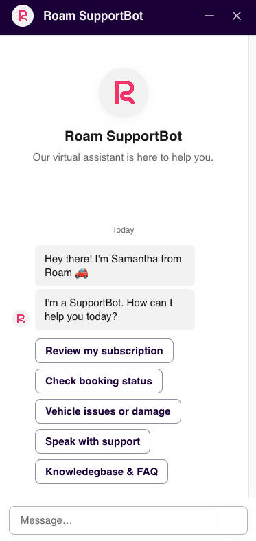 Roam’s UI, powered by Voiceflow, offers a friendly and intuitive experience with an AI chat agent that integrates seamlessly with a knowledge base. Users can effortlessly interact by selecting buttons instead of typing messages, making the process smooth and efficient.