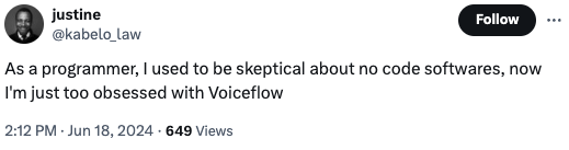 Voiceflow is the leading enterprise chatbot development platform. Indeed, Nick Coatsworth from Roam mentioned, “I can literally jump into Voiceflow without any training, use a template, and create a powerful AI agent—it’s that simple”.