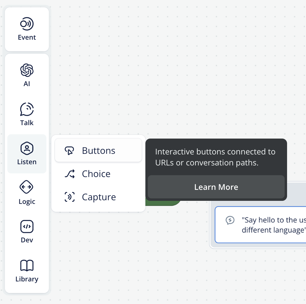 8. Create a new button box by hovering over “Listen”, then “Buttons”. This function lets your users press a button rather than provide a text-based answer.
