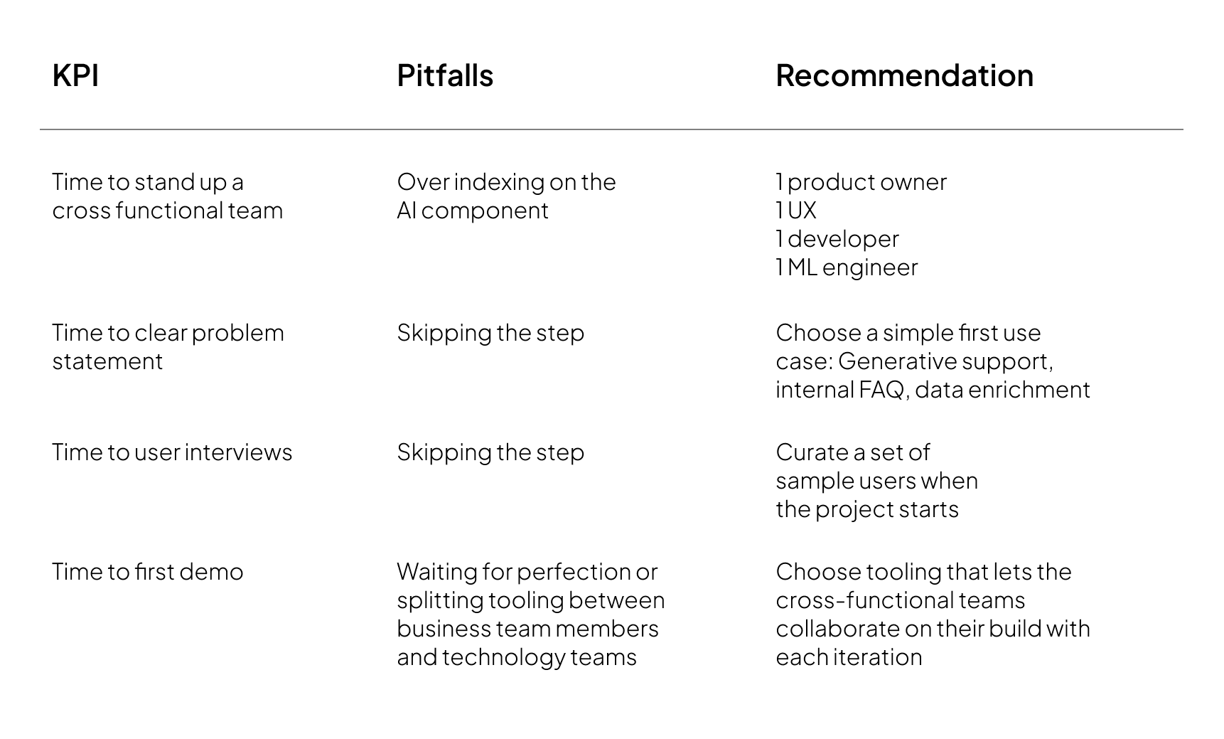 As a leader, your core objective is to unblock teams and provide a space to iterate and improve AI products. Each of these objectives should come with their own key performance indicators to track and measure time until delivery.