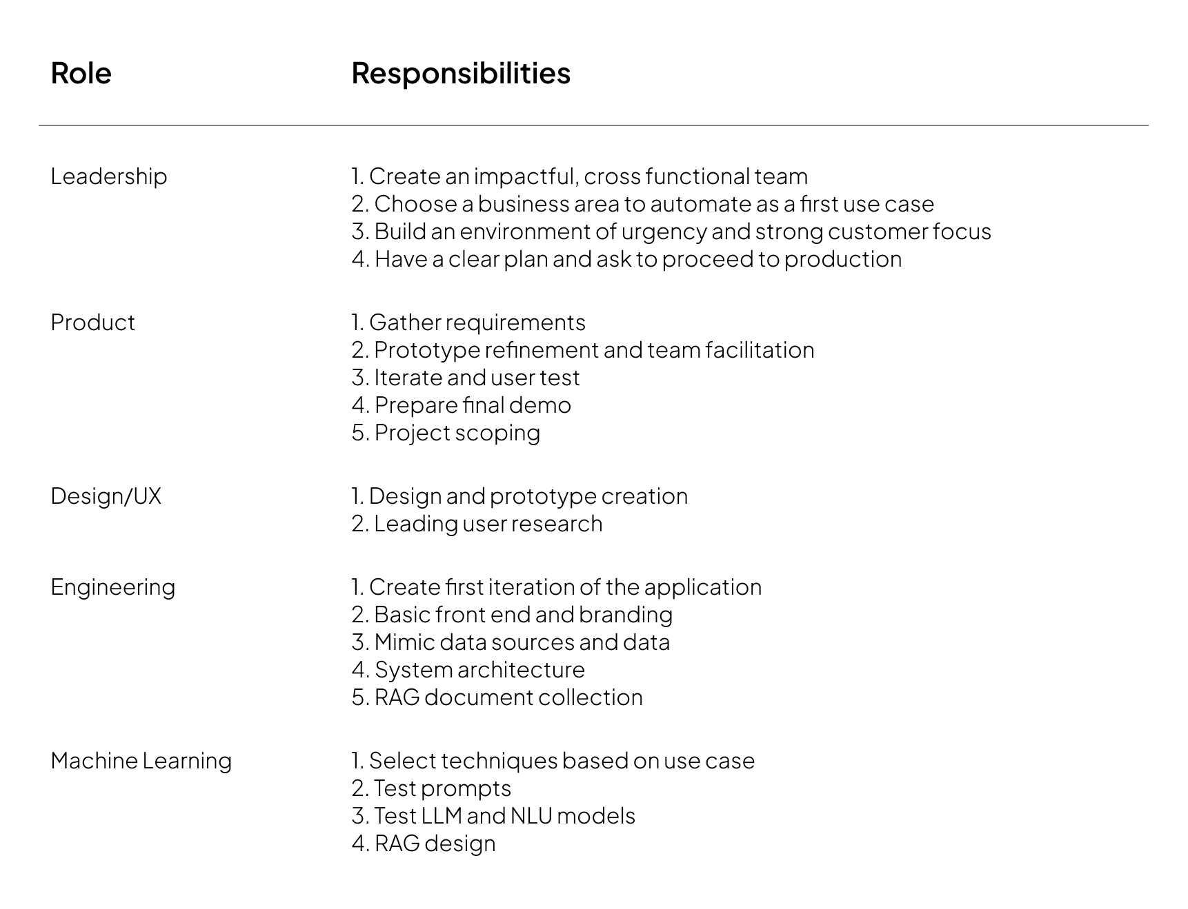 Leaders need to structure a team that’s set up for success. Many generative AI projects have been staffed exclusively within a ML or IT team, ignoring cross-functional needs to build strong customer experiences and corresponding business cases. This team should be capable of deep diving into a problem area and creating clarity in a fast paced space. Although not a strict list, successful POCs typically have inputs from a product owner, UX, developer and ML engineer.