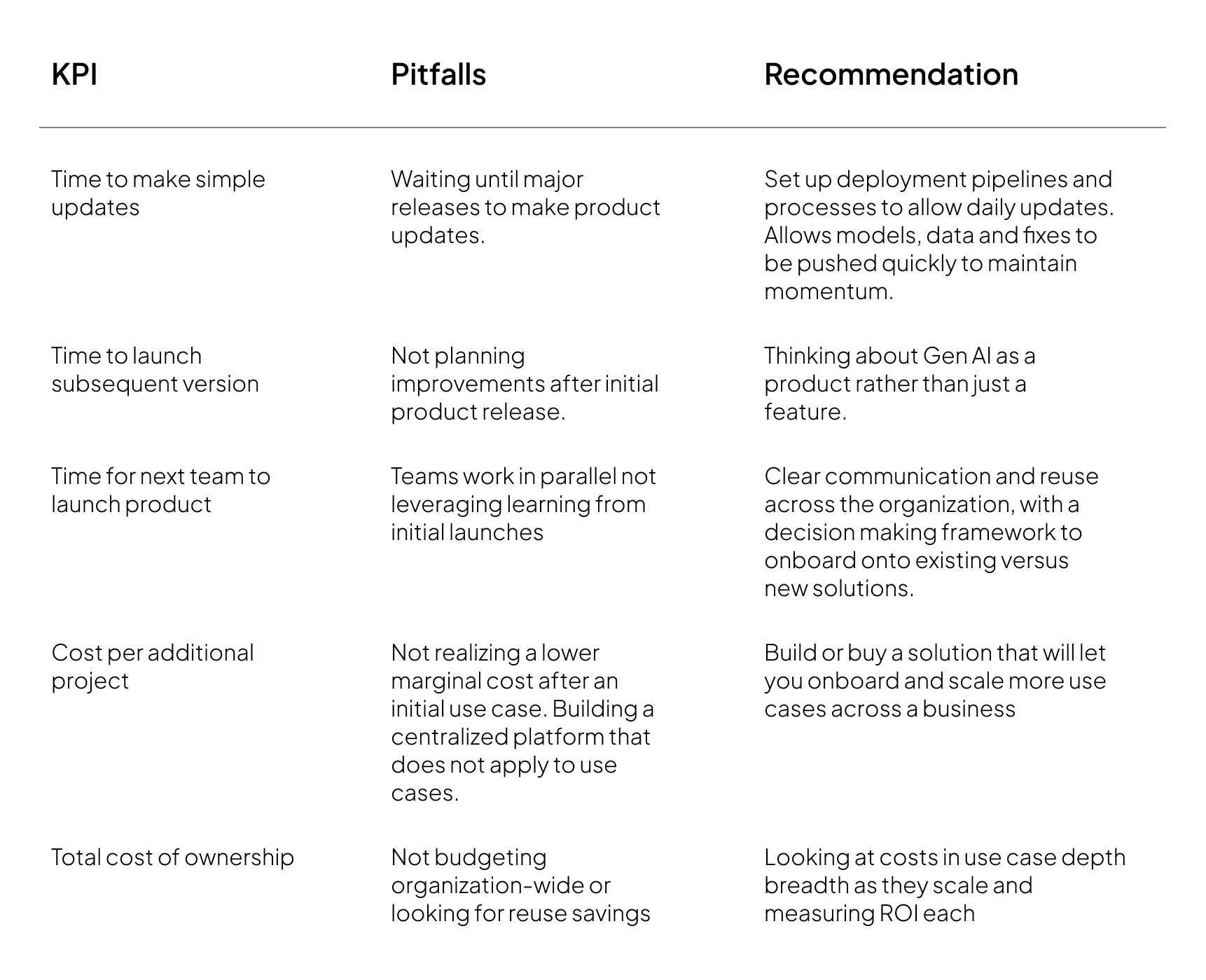 Launching the feature live is the final milestone. Once the first application goes into production, there will likely be more projects starting, so the KPIs can apply across new projects across the organization. It’s important that leaders have set a clear product roadmap and teaming structure so that each new use case and iteration is not additional technical debt, rather an additive product lifecycle that becomes more efficient with each new launch.