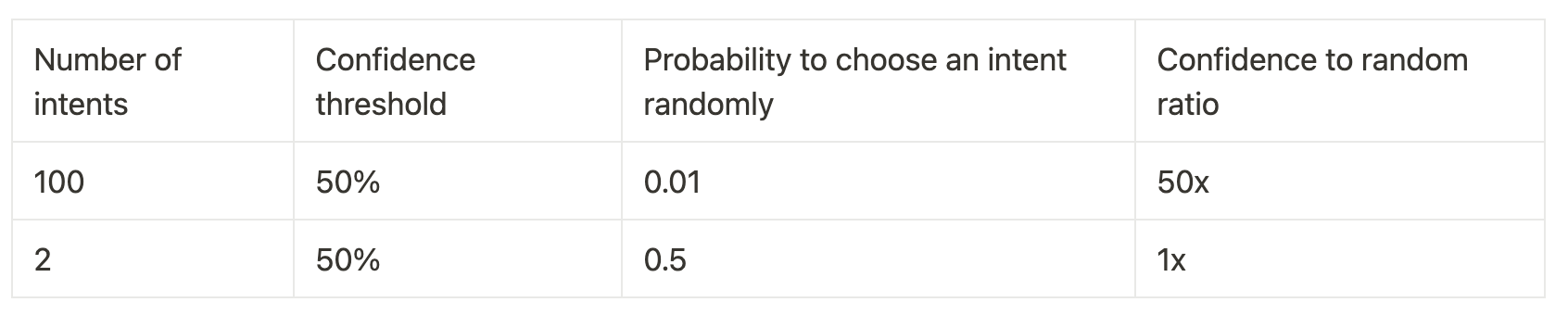The complexity of your project will also affect what your confidence for an intent should be. If you have 100 intents and one scores 50% on confidence, that’s much better than intent that scores 50% when there are only two options!