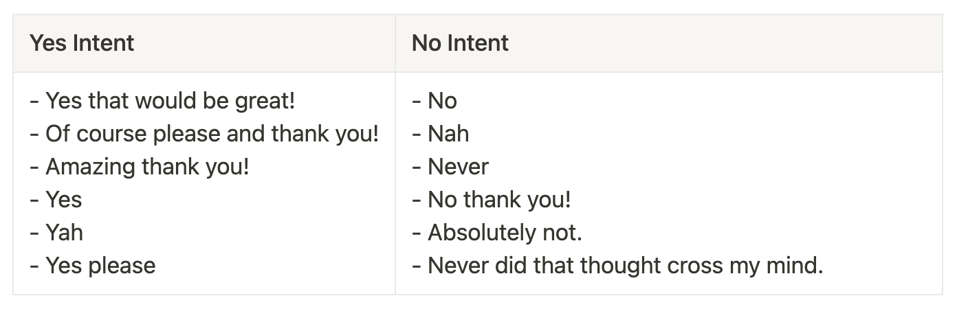 Let’s say we have two intents, yes and no with the utterances below.