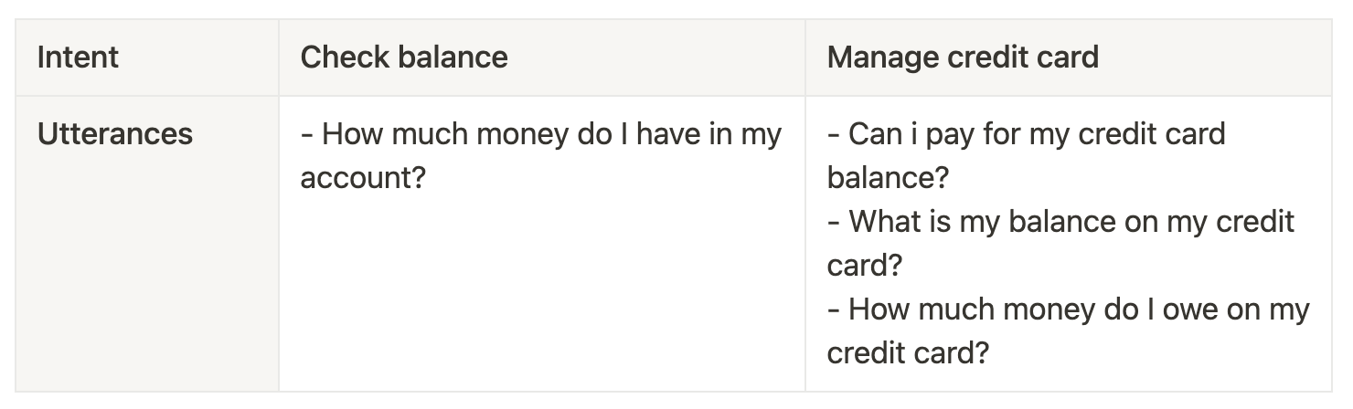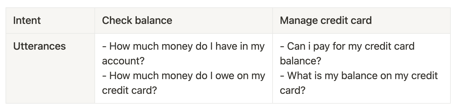 Let’s say we’re building a simple banking application, with two intents, check balance and manage credit card. They have the following utterances: