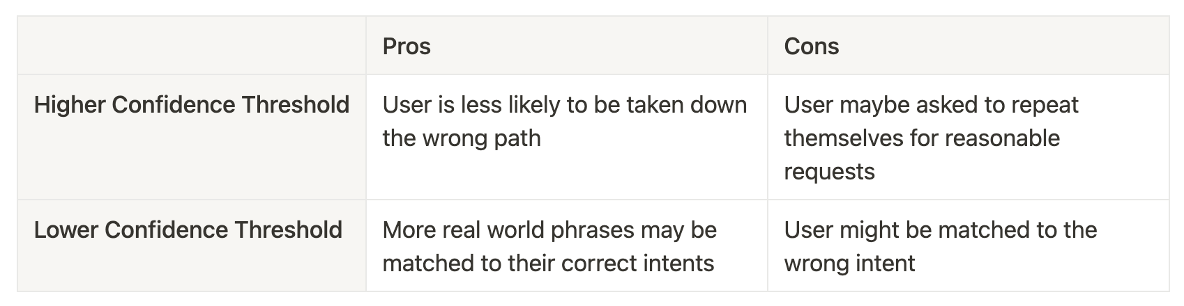 Likewise in conversational design, activating a certain intent leads a user down a path, and if it’s the “wrong” path, it’s usually more cumbersome to navigate the a UI. We should be careful in our NLU designs, and while this spills into the the conversational design space, thinking about user behaviour is still fundamental to good NLU design.