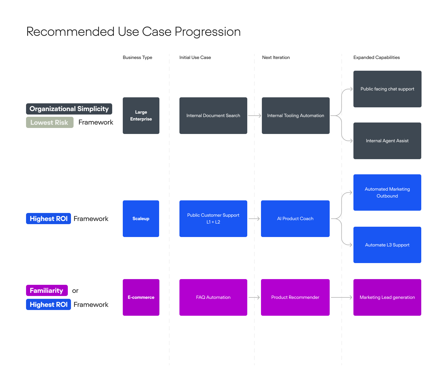 Now that you’ve chosen your approach to building an AI project based on your priorities, you’ll need to start looking to the future. Depending on whether your organization is a large enterprise, a scale up, or an e-commerce business, thinking through initial use cases and their expanded capabilities will help garner support and momentum for future AI projects or greater returns.