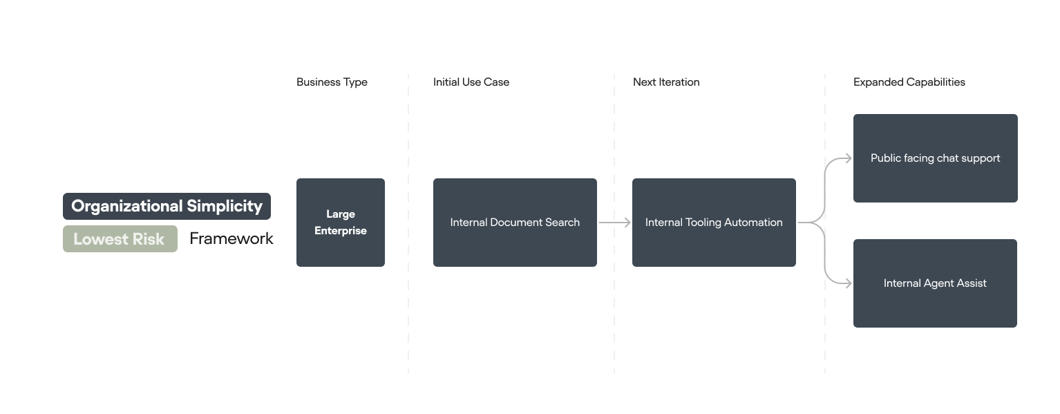 For a large enterprise implementing AI, using a Low risk or Simple org frameworks helps build momentum. Below is a recommended progression.