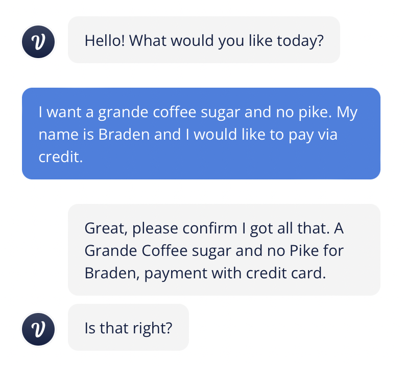 When a user underfills, the experience hinges on how deftly your assistant fishes for additional information—and just the information needed. If they said “coffee” but not which type, it should ask for the type, but not the entire order again. (Sounds obvious, but not obvious.)