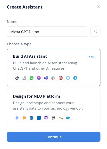 First, sign into your Voiceflow account and create a new Alexa assistant.