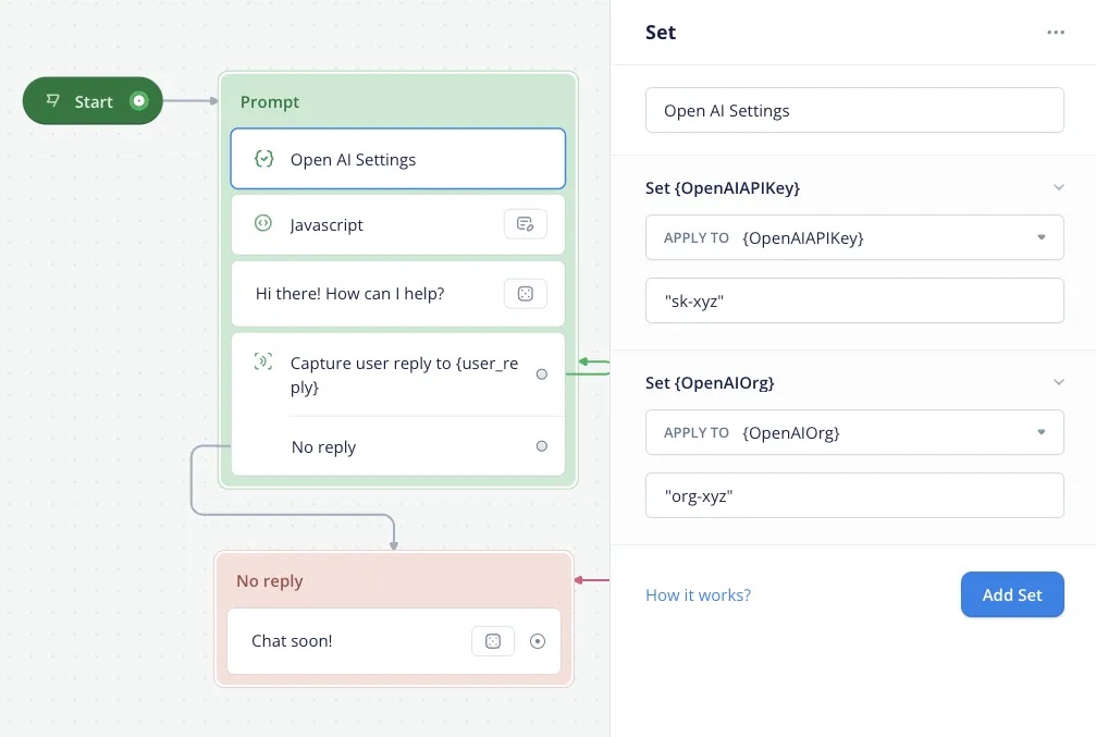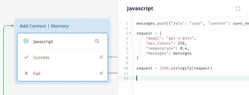 Then use a Javascript Step below to initiate the variables and push the first content to the {messages} array.