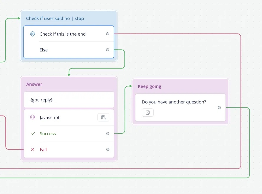 Loop back to the Capture step to allow the user to ask another question or end the conversation if gpt_reply is “1”.