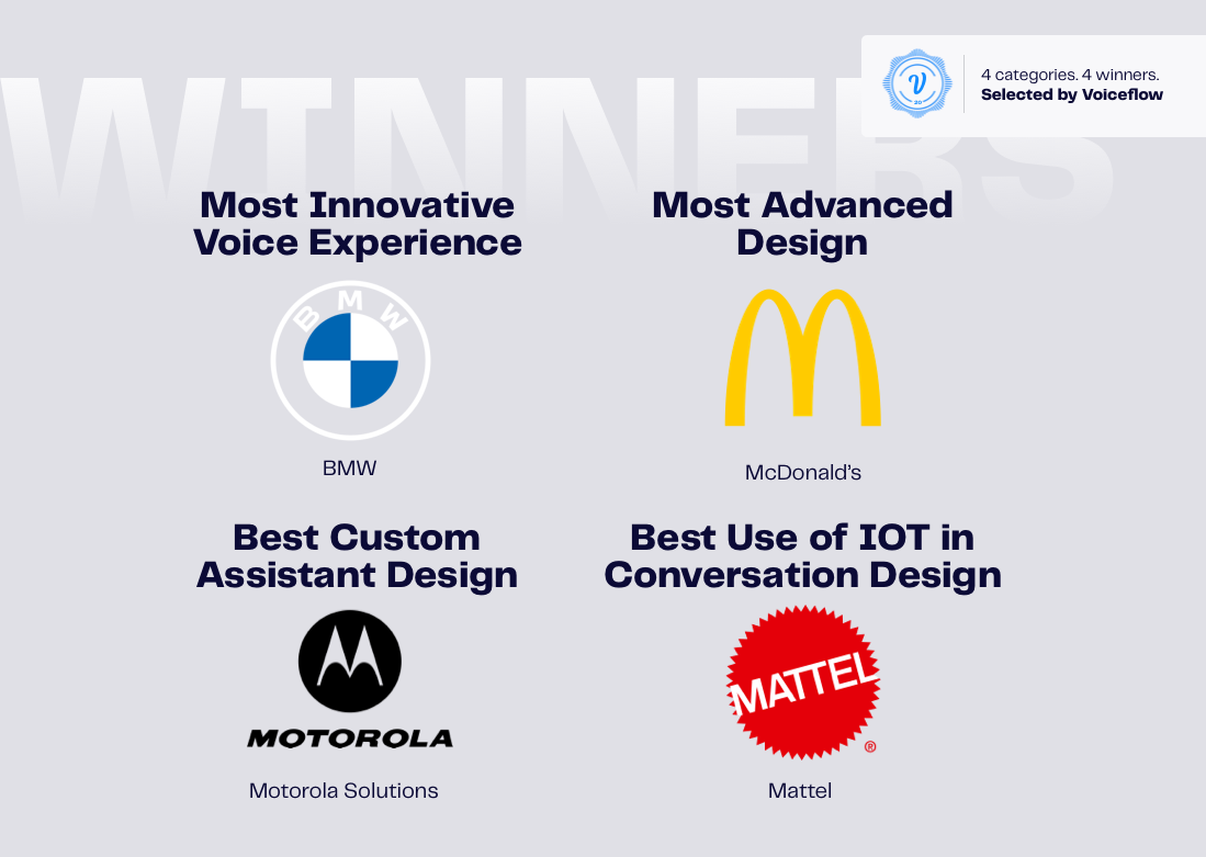 This year, the Voiceflow Team Awards were broken down into four separate categories, honoring excellence in voice design, innovation, and user experience among the industry's very best CxD teams using Voiceflow. The categories are: