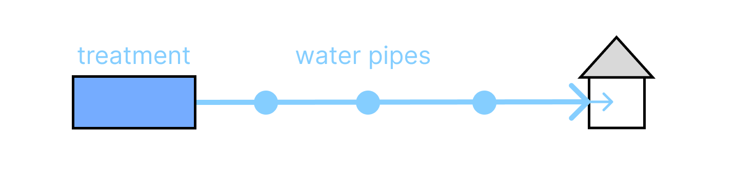 At my place, I have a water pipe and a sewer pipe. Water needs to get to me somehow from the reservoir, and my sewage needs to reach the wastewater treatment plant. There are some immediate stages along the way: processing (filters, pumps), storage (water tower), and junctions.