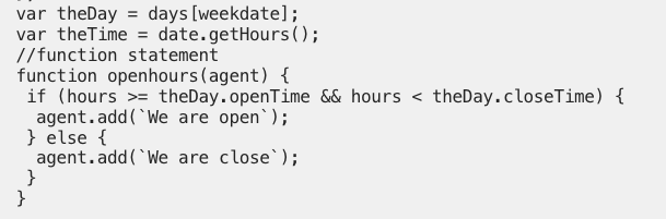As an example, let’s say you need your Dialogflow Agent to answer differently when your business is open versus closed. If closed, we’d want to surface the next set of open hours and a way to get in touch. If open, we’d want to share the live ordering options.