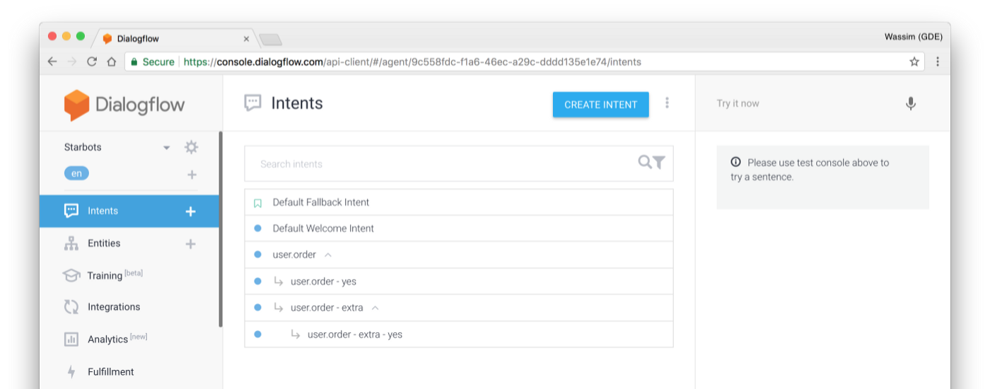 Example 2: Now we have the main intent (order caramel latte), a follow-up intent to confirm, a second follow-up to add whipped cream, and an extra ‘yes’ confirmation intent to confirm the whipped cream.