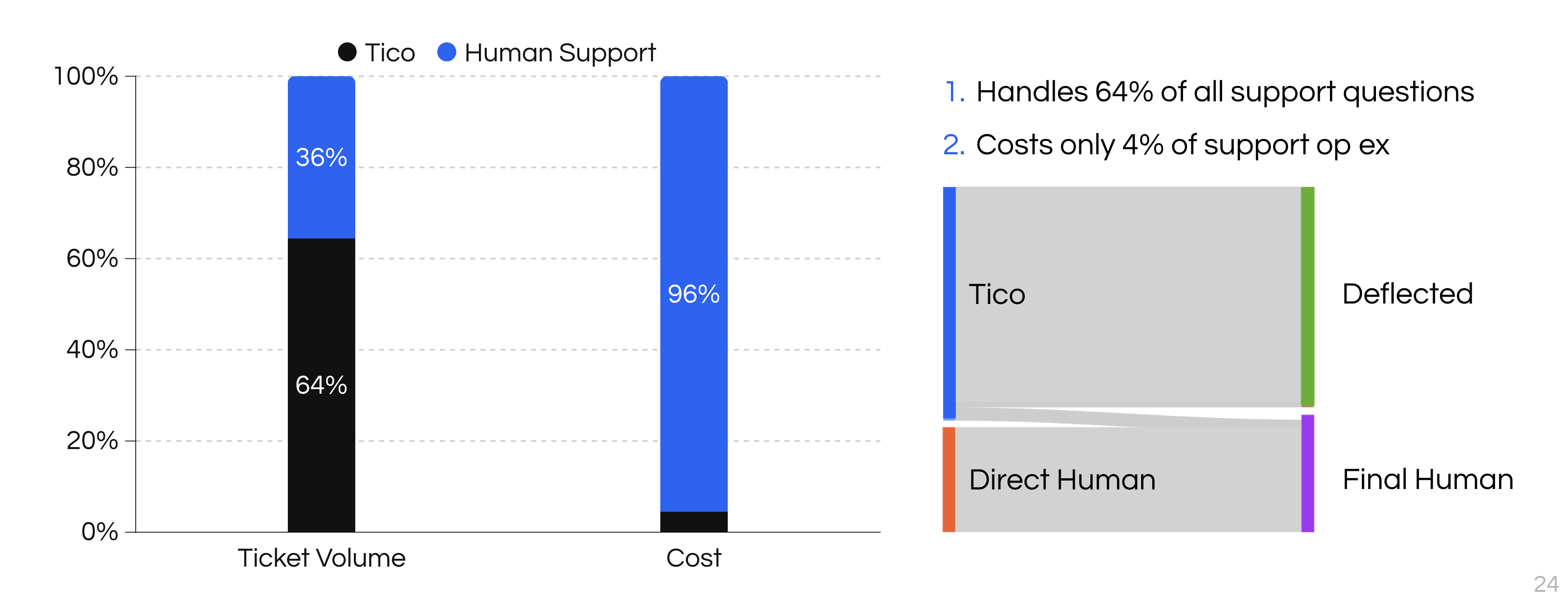 Tico managed 64% of all support questions while incurring only 4% of the total support operational expenses. This means the Voiceflow support team could reliably lean on AI's capacity to provide first-line assistance.