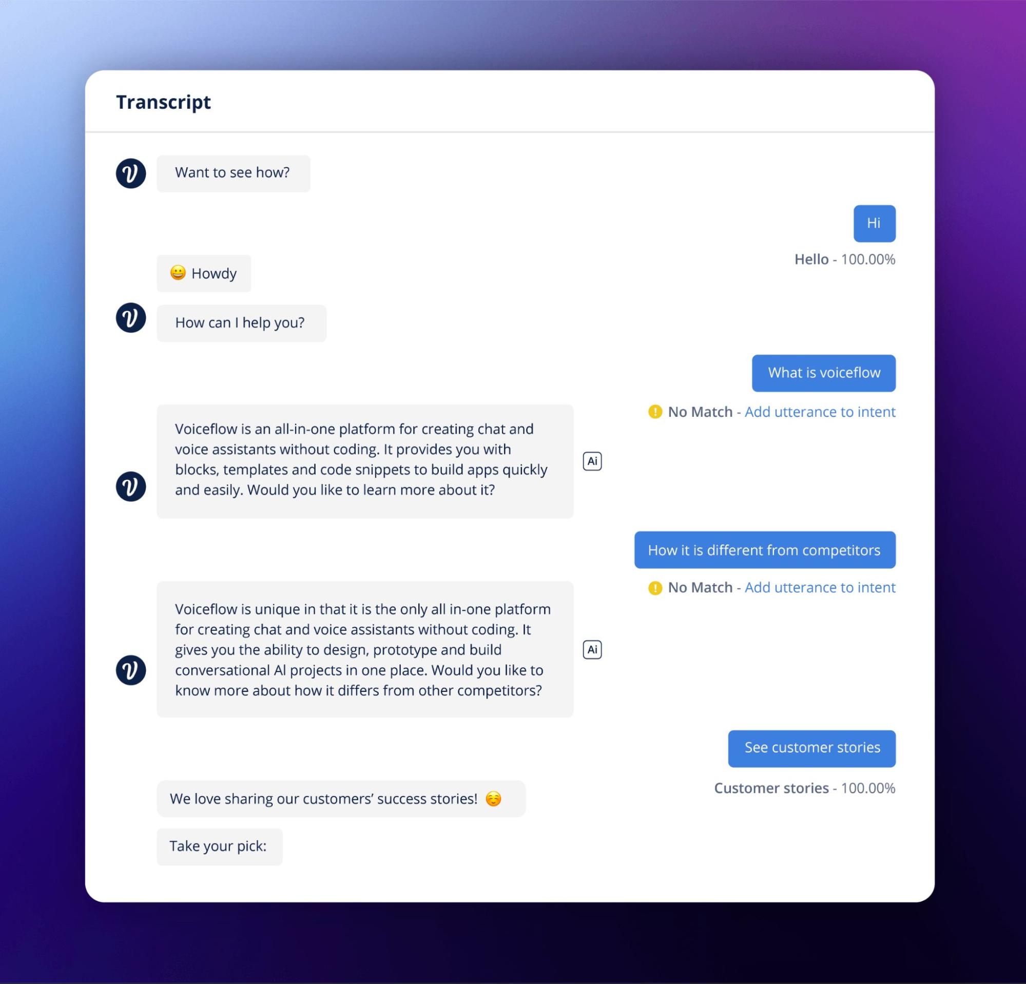 You can see the handoff from our rules-based dialog manager in the screenshot below. When it reaches the “What is Voiceflow” utterance, you can see the “no match” icon. That boots up our LLM which is fed the conversation context to take a pass at the response. You can see the “Ai” icon next to that response, so we know where that came from. The same thing happens for the question, “Who are your competitors?”