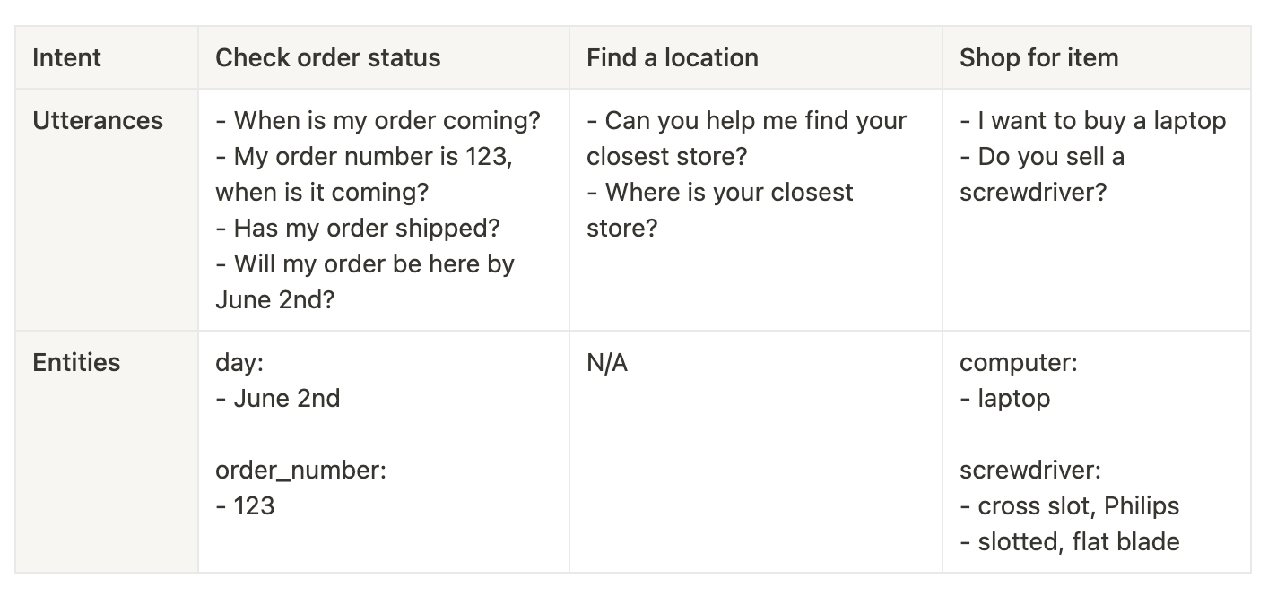 Each entity might have synonyms, in our shop_for_item intent, a cross slot screwdriver can also be referred to as a Phillips. We end up with two entities in the shop_for_item intent (laptop and screwdriver), the latter entity has two entity options, each with two synonyms.