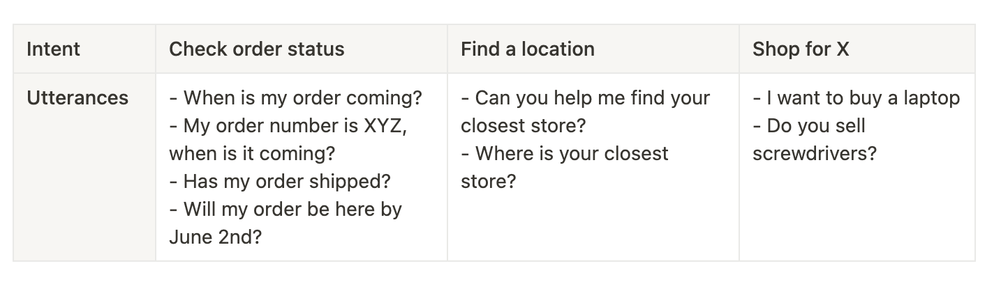 Currently, the leading paradigm for building NLUs is to structure your data as intents, utterances and entities. Intents are general tasks that you want your conversational assistant to recognize, such as ordering groceries or requesting a refund. You then provide phrases or utterances, that are grouped into these intents as examples of what a user might say to request this task. These utterances help the NLU generalize what a user might say.