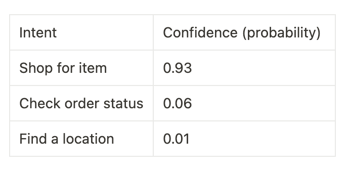 With this output, we would choose the intent with the highest confidence which order burger. We would also have outputs for entities, which may contain their confidence score.