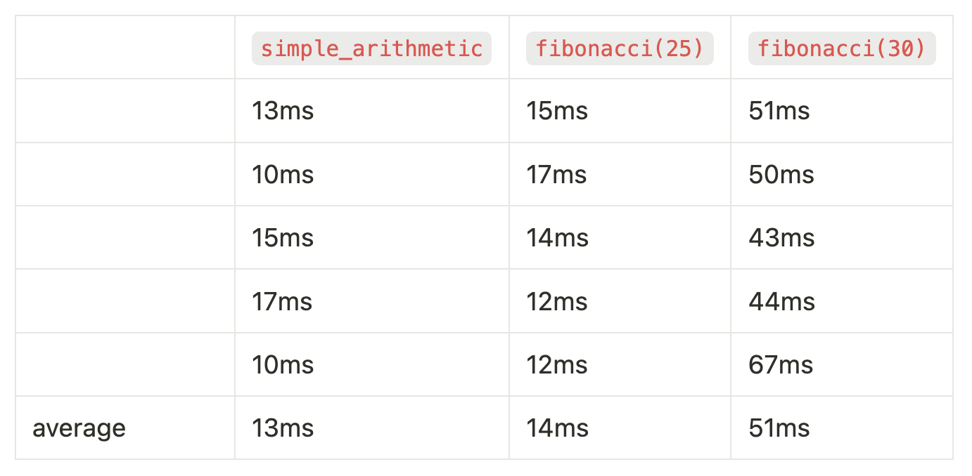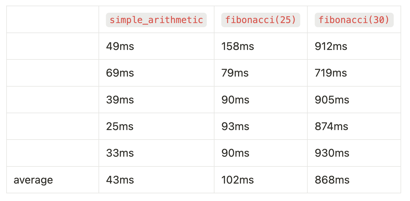 We’ve noted that loading the code to run a function can often take a significant amount of time. This varies depending on the size of the code:
