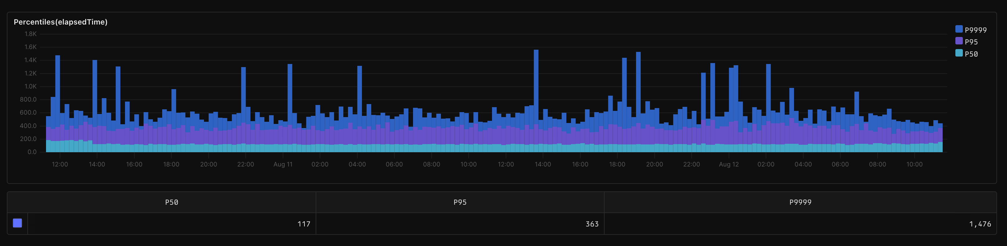 We can see that P50 and P99.99 times are both drastically lower. P99.9 time is under 1 second.