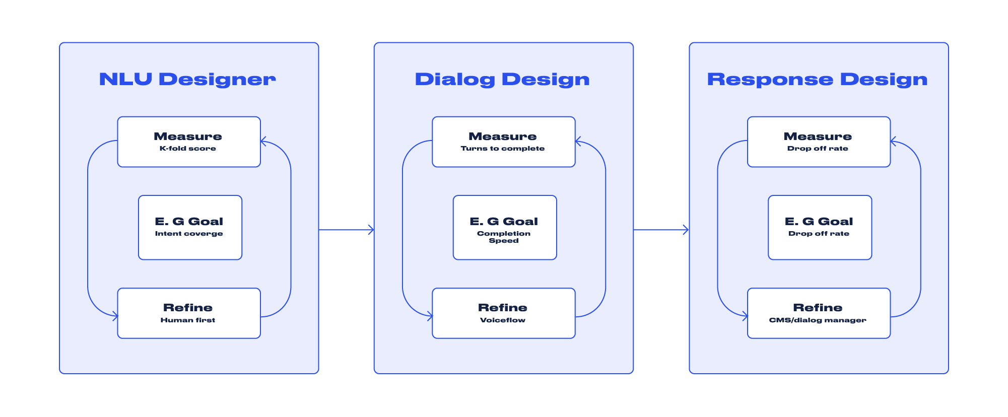 - Training and NLU design: The design process needs a strong data foundation, which informs the AI's understanding of user interactions. This is where NLU comes into play, by focusing on enhancing the AI's ability to discern user intent and context through intent discovery, utterance generation, and model testing.