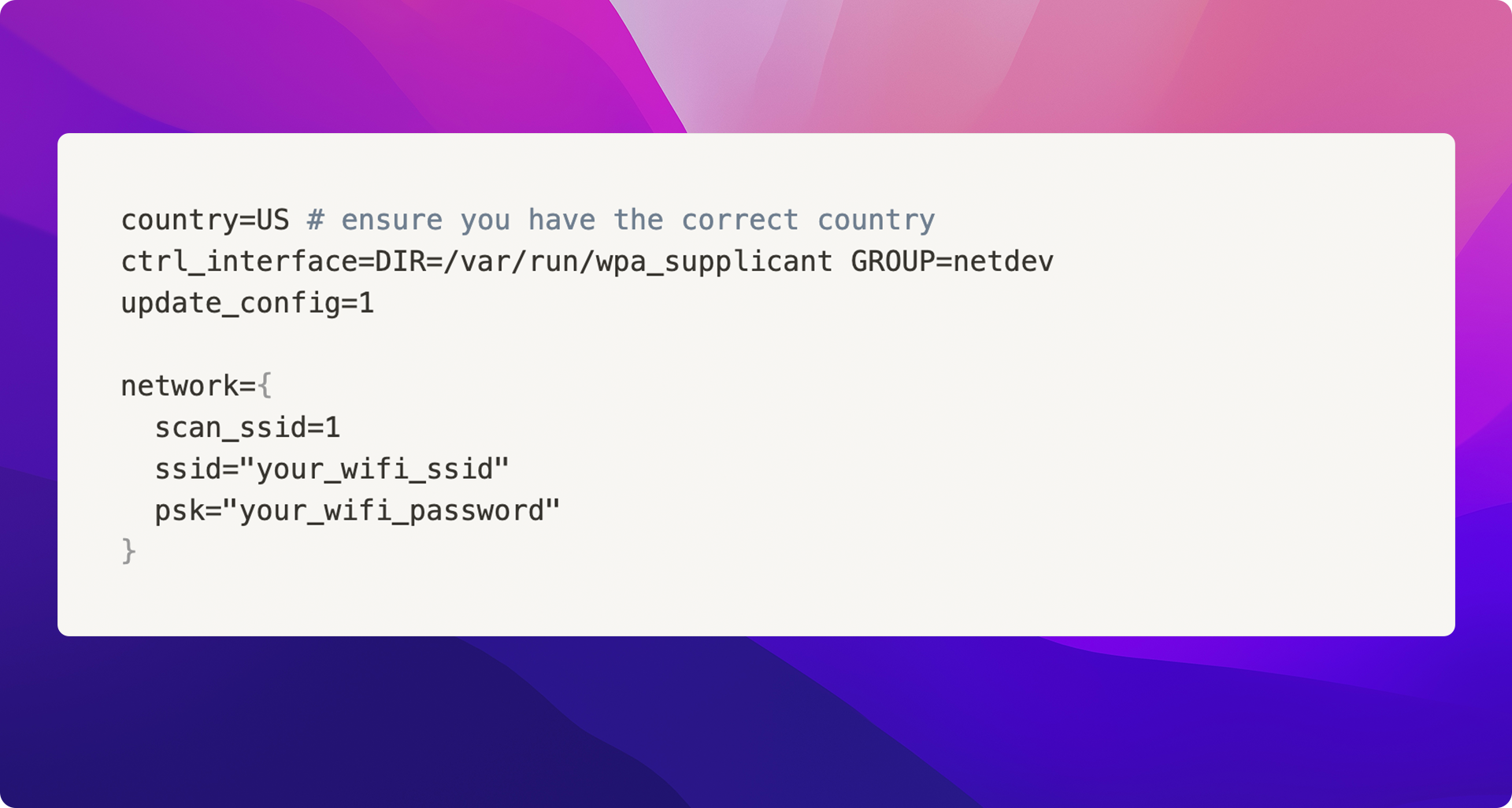 - Enable Wifi by creating a file called {% c-line %}wpa_supplicant.conf{% c-line-end %} in the {% c-line %}boot{% c-line-end %} drive of your Rpi SD Card with the following contents