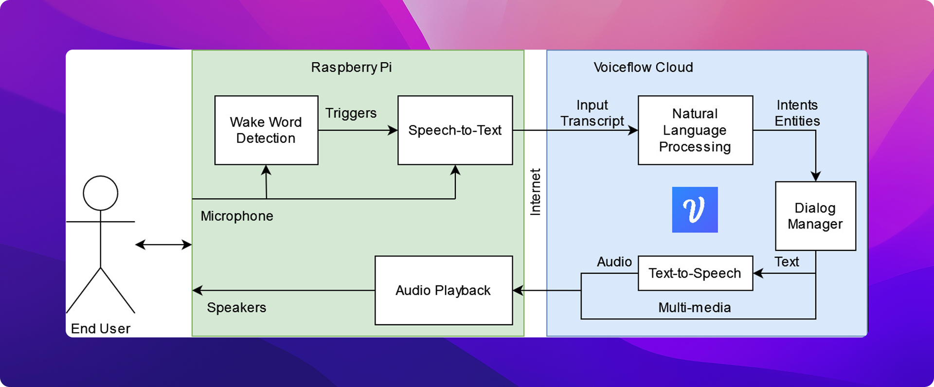 The Raspberry Pi is a thin client, in this application, since it is only responsible for calling Voiceflow's dialog manager API with the user input transcript, and playing back the audio generated from Voiceflow. The language model and logic of your conversational agent can be designed and tested on the Voiceflow Creator tool.