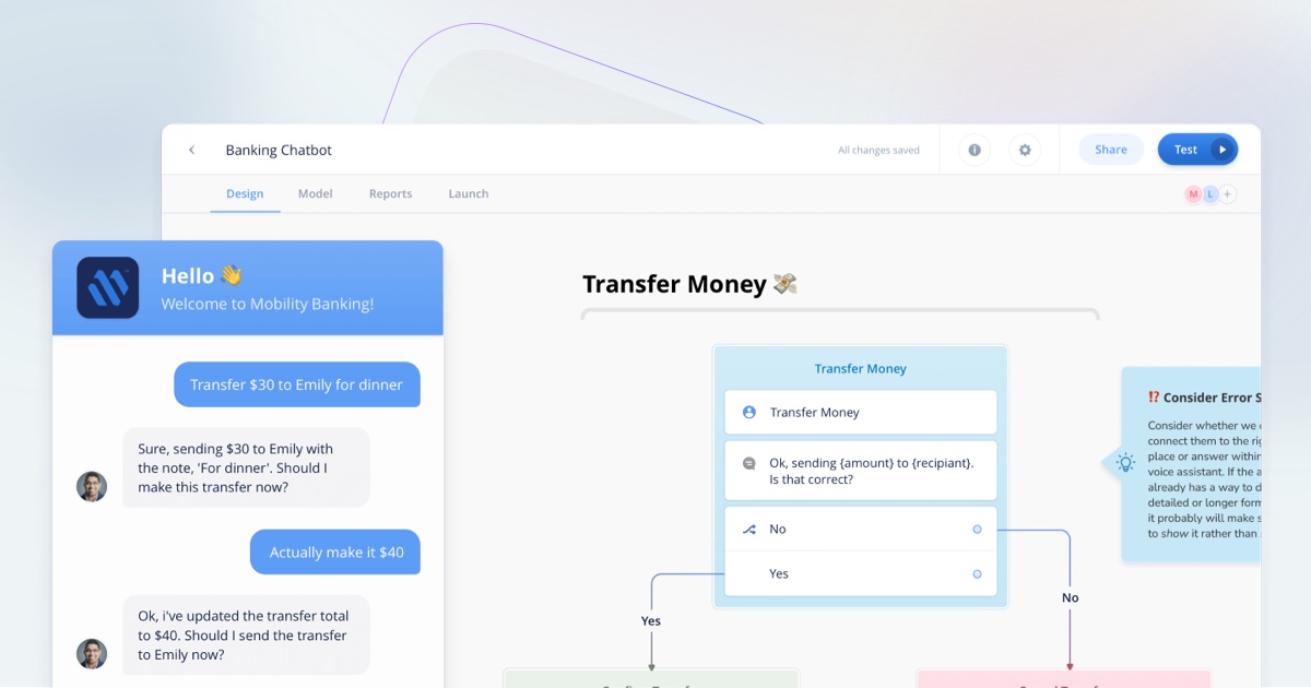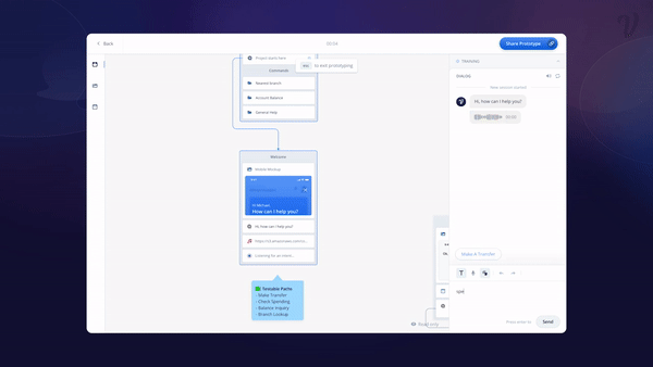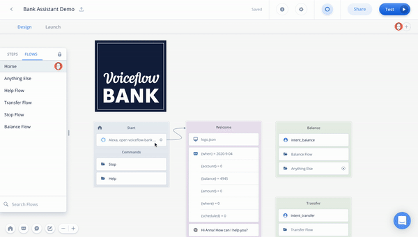 - Context switching: No one likes rigid, linear conversations. Voiceflow allows for both open and closed dialogs, which makes context switching possible. In the banking experience, if a user is checking an account balance they can quickly switch to another top-level intent (i.e. transfer funds) that the designer has made available to the user at all times. You can see that in action here as the assistant seamlessly helps the user with the mid-conversation request. Switching context is part of natural conversations.