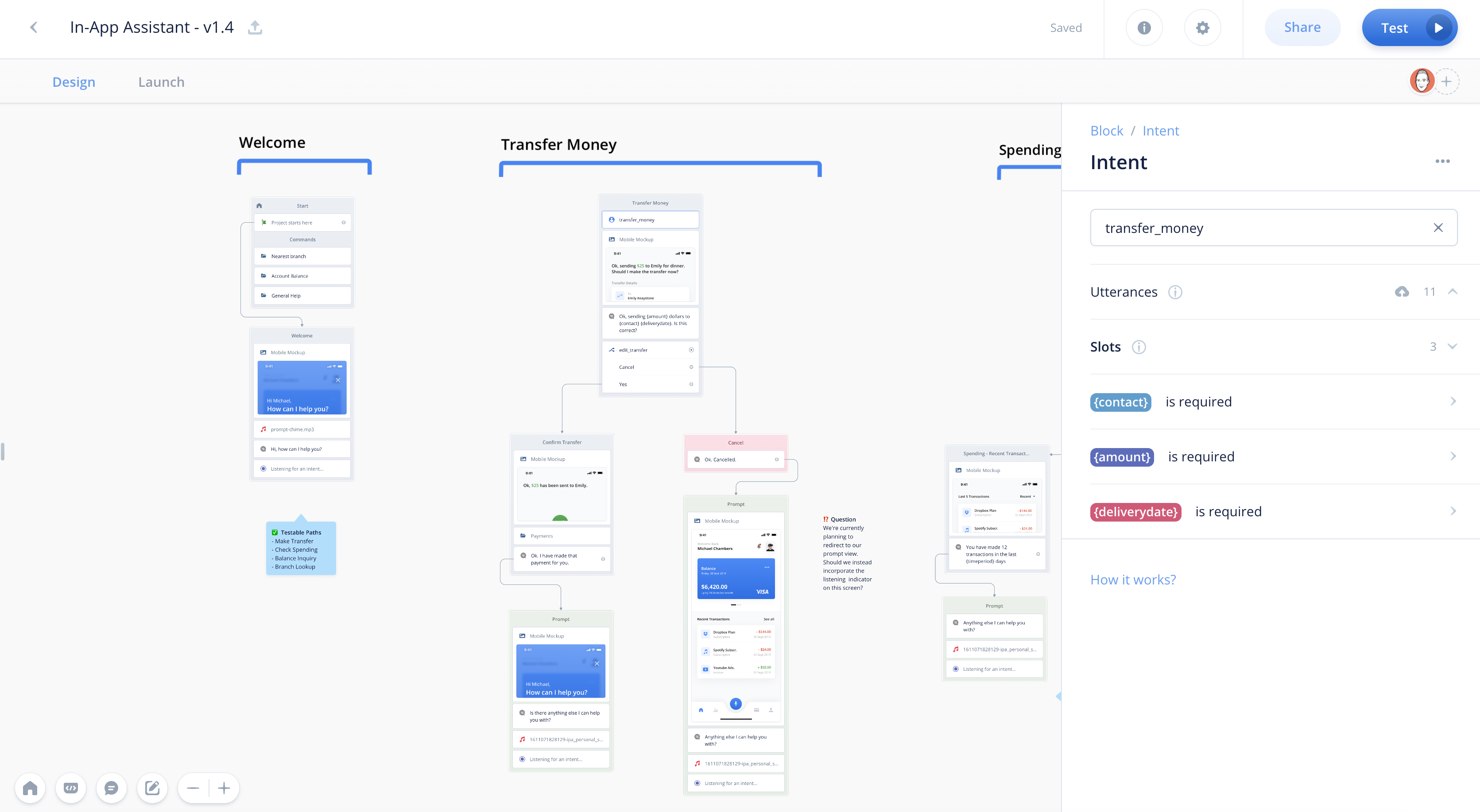 Take a bank assistant. The conversation designer working on the project needs to clearly define a set of top-level functions - welcome, transfer money, spending history - to improve their own workflow and the user experience.
