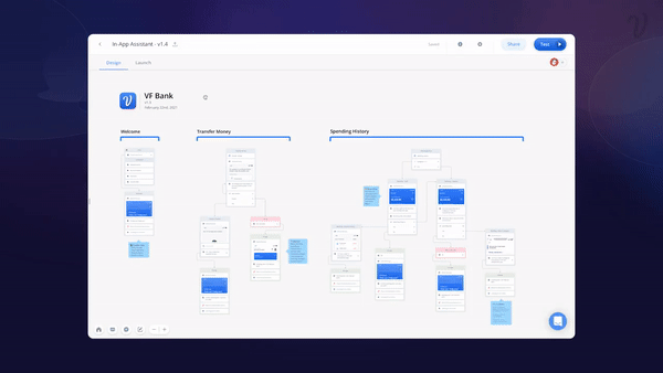 Voiceflow's shared workspaces allow any team to manage their workflow with a built-in Kan-ban system to see an at-a-glance status of all projects. Inviting stakeholders or clients directly to a workspace makes it easy for viewing and commenting. Users can even build an internal component system or template library to manage design consistency across all of their projects. For larger organizations, users can manage multiple team workspaces to ensure no one workspace becomes too crowded.