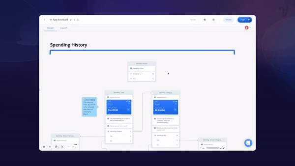 One of the biggest challenges for designers is effectively communicating their work. Whether it's with other designers, the development team, or stakeholders, it can take months to develop and implement a flowchart design system. Voiceflow 2.0's canvas markup bakes context directly into the canvas, allowing designers to build while documenting their experience – all in one place.