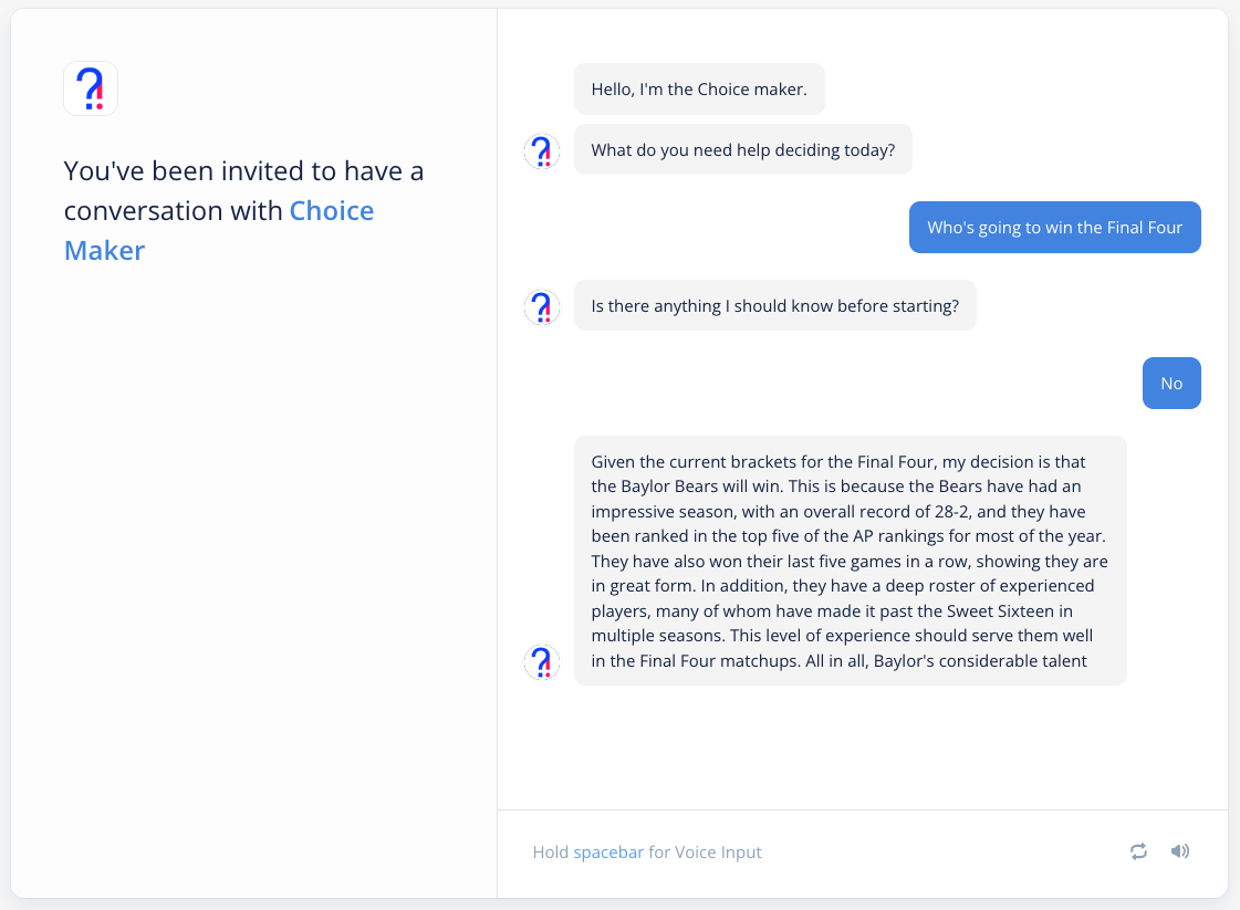 The attendees’ curiosity quickly turned into excitement. Most were impressed by the conversational nature of the decision-makers, which was augmented by a natural-sounding voice. Even people familiar with LLMs like ChatGPT were blown away by how thorough and thoughtful the bots’ responses were.