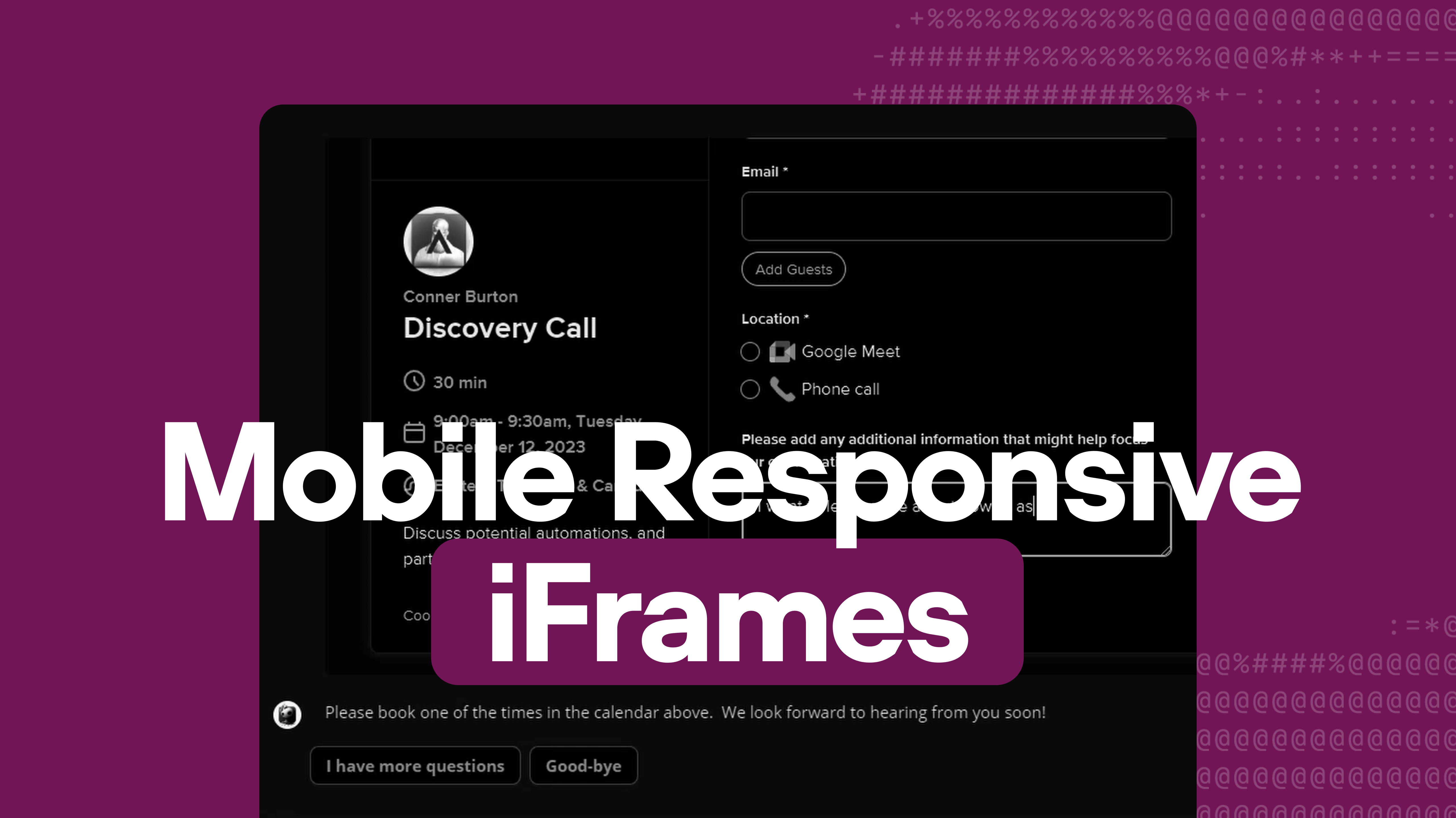 New update allowed iframes to render in the VoiceFlow designer/testing environment, which is a huge quality of life upgrade!Also, don't make the same mistake I did with mobile responsiveness chat. Probably cost me a lead. Calendly iFrame Embed Video I reference (has code snippet you need): https://www.youtube.com/watch?v=oqOh8PYyAFM&t=0s
